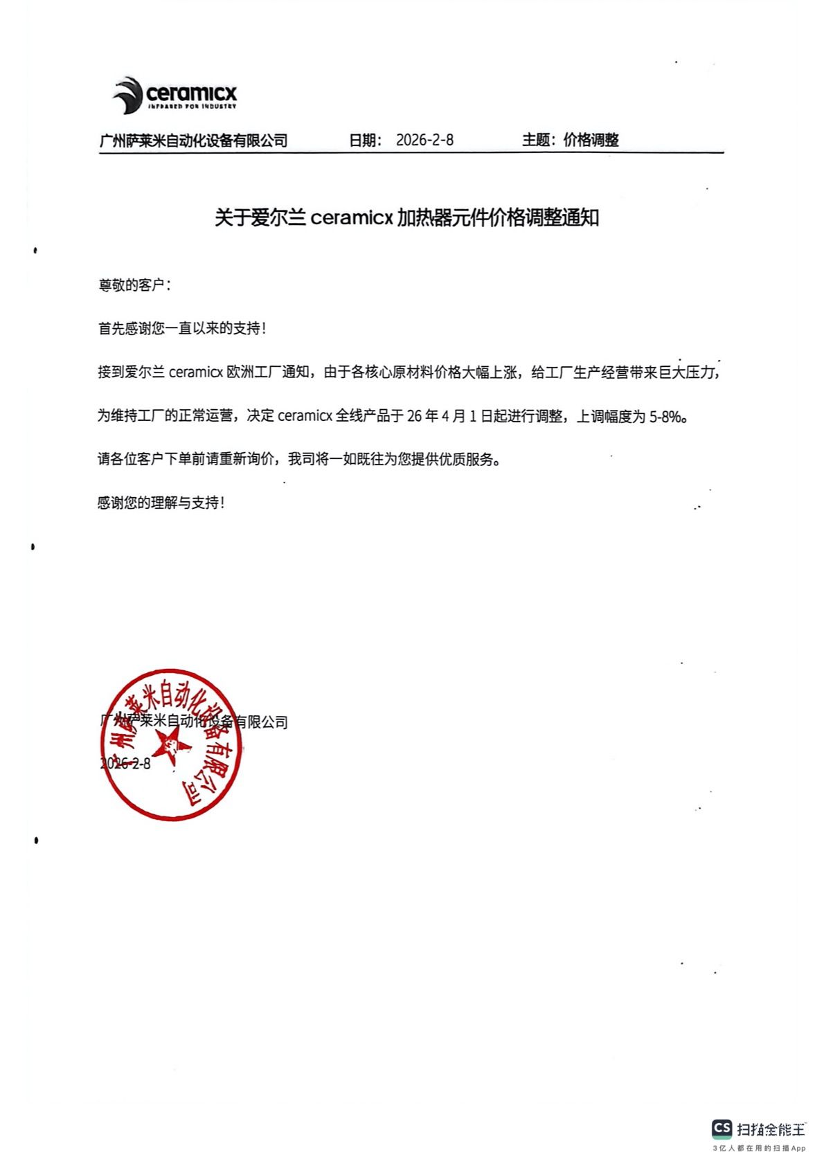 尊敬的客户: 由于欧洲通货彭胀因素导致ceramicx工厂的原材料成本及人工成本上涨,给正常经营活动带来了较大的压力,因此我司不得不对ceramicx产品的销售价格进行调整。 从2025年5月1日起,所有ceramicx产品将执行新的销售价格,具体请与我们销售人员确认。