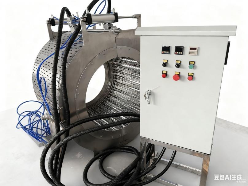 圆形加热系统分为左右两个半圆,并通过气缸动作,可以使加热系统打开或关闭,加热系统采用吊装形式,可由吊机吊起,然后移动到被加热管道上方,再抱住管道进行加热。
